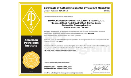 The company has established advanced and perfect internal control system and quality control system, passed API spec Q1 and API 13A certification, ISO 9001 quality management system certification, 14001 environmental system certification, 18001 occupational safety and health system certification, HSE health safety and environmental protection system certification and CNPC oilfield chemical agent quality certification.