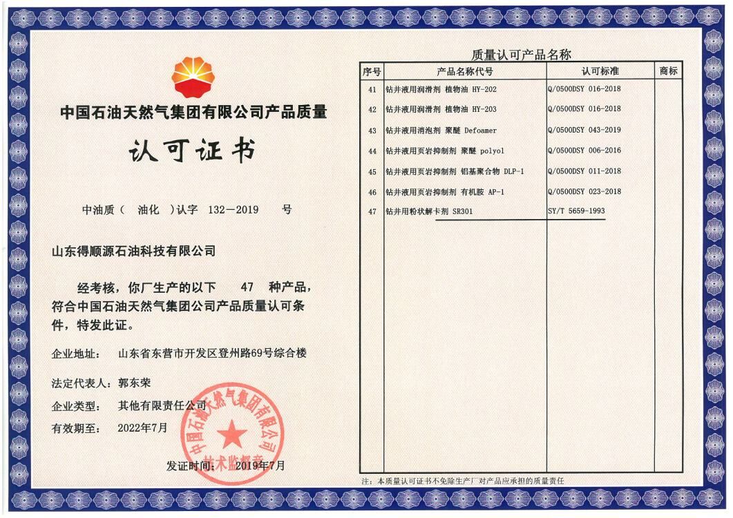 2019年7月18日,公司順利通過了中石油產(chǎn)品質(zhì)量認可證的換證復審,并換發(fā)新證書。其中抗高溫淀粉SHR-1、納米二氧化硅NS-1和清潔劑RH這三個產(chǎn)品也順利增加到中石油產(chǎn)品質(zhì)量認可證內(nèi),產(chǎn)品數(shù)量增加到47個。