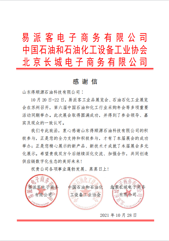 2021年10月20日,2021易派客工業(yè)品展覽會(huì)暨石油石化工業(yè)展覽會(huì)在蘇州國(guó)際博覽中心開(kāi)幕。這是目前國(guó)內(nèi)首個(gè)石油、煉油與化工行業(yè)泛工業(yè)品綜合展會(huì)。中石化集團(tuán)公司副總經(jīng)理劉宏斌、李永林出席開(kāi)幕式并致辭,江蘇省副省長(zhǎng)胡廣杰出席。山東得順源石油科技有限公司受邀參加“易派客主題論壇暨戰(zhàn)略合作簽約儀式”、“易派客平臺(tái)核心關(guān)聯(lián)方座談會(huì)”和“油田化學(xué)劑專家論壇”等核心論壇。開(kāi)幕式后孫衛(wèi)東副總經(jīng)理陪同中石化和江蘇省領(lǐng)導(dǎo)巡展各專業(yè)化展區(qū)。在“易派客主題論壇暨戰(zhàn)略合作簽約儀式”上孫衛(wèi)東副總經(jīng)理代表公司簽署《易派客平臺(tái)戰(zhàn)略合作協(xié)議》,成為鉆井液助劑行業(yè)唯一戰(zhàn)略合作單位。