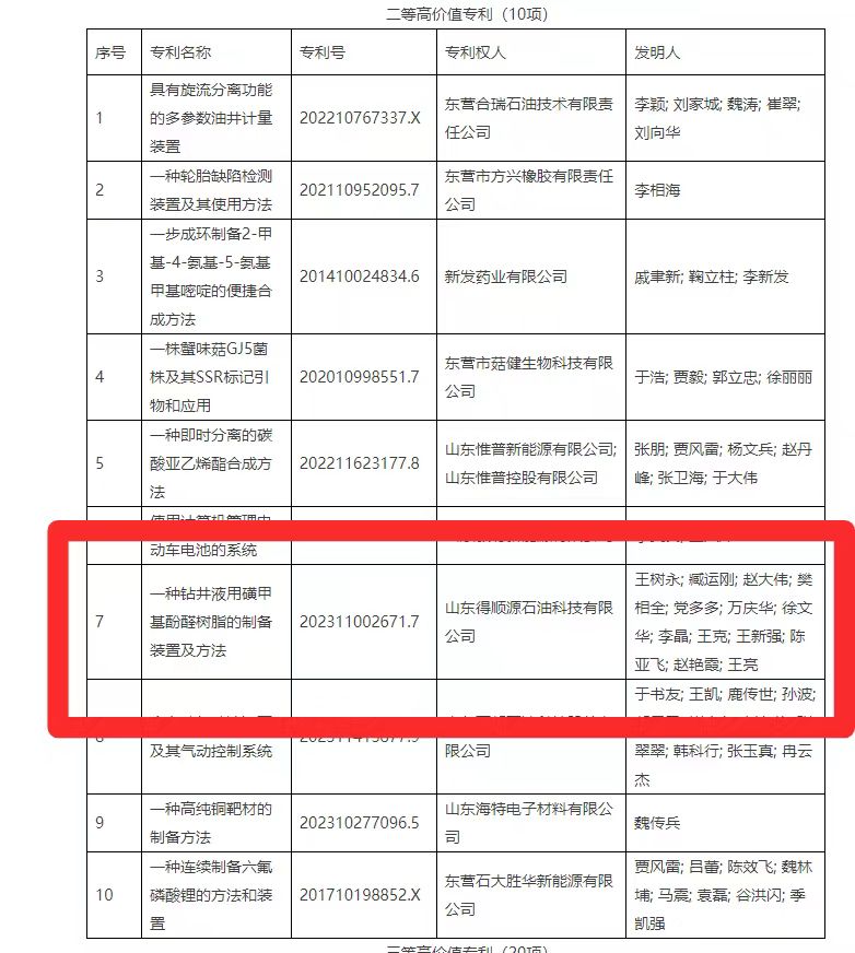 根據(jù)《東營(yíng)市支持專利創(chuàng)造辦法》(東政辦字〔2022〕10號(hào))規(guī)定,2024年度東營(yíng)市高價(jià)值專利擬扶持項(xiàng)目已經(jīng)完成公示,其中重大高價(jià)值專利1項(xiàng),一等高價(jià)值專利5項(xiàng),二等高價(jià)值專利10項(xiàng),三等高價(jià)值專利20項(xiàng)。我公司申請(qǐng)的《一種鉆井液用磺甲基酚醛樹脂的制備裝置及方法》專利獲得二等獎(jiǎng)。